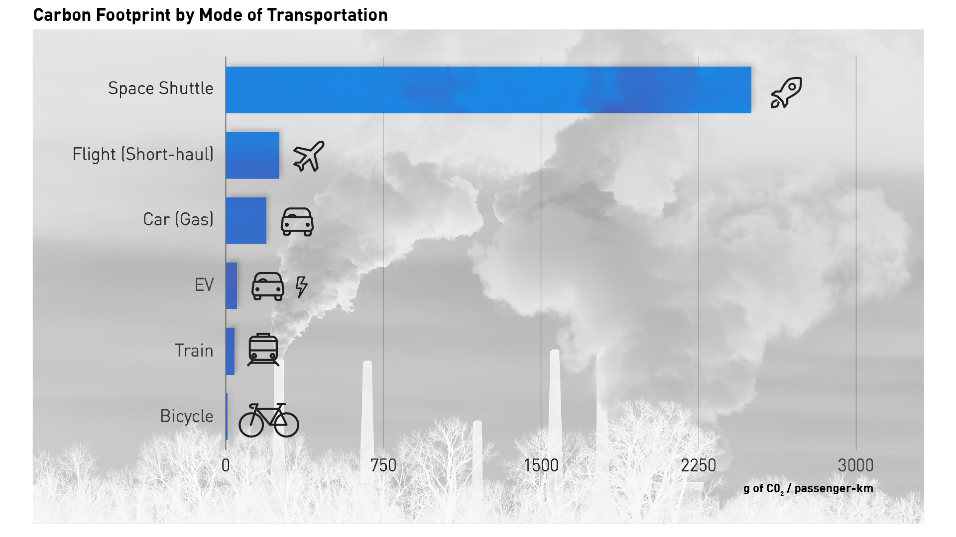 As seen from the graph below, trains remain at the bottom of the list for the CO2 footprint, followed by the gasoline cars. And the former outperform short-haul flights with an 84% decrease in carbon emissions.